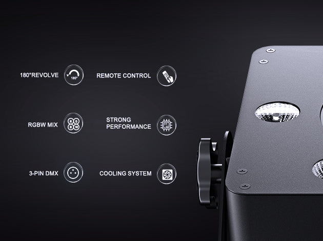 "Supporting DMX512, 20m distance wireless remote control, and manual control mode DMX512 and power input/output interface, supporting master-slave series mode"