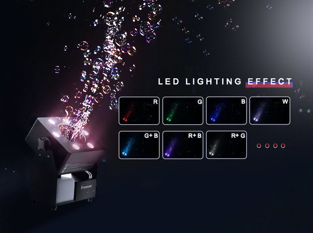 The device is equipped with 6 RGBW LEDs 4in1 which can render various effects of colored bubbles in dark environments,