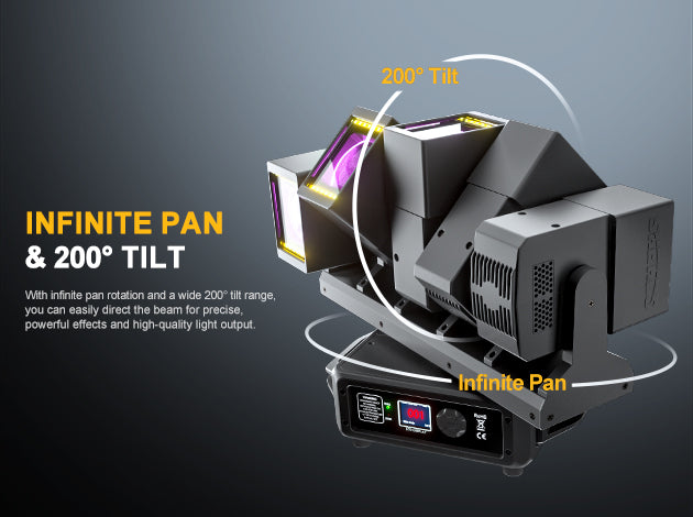 With infinite pan rotation and a wide 200° tilt range, you can easily direct the beam for precise, powerful effects and high-quality light output.