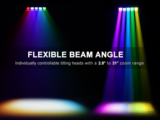 Individually controllable tilting heads with a 2.8° to 31° zoom range