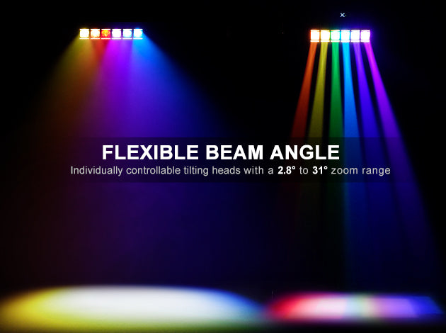Individually controllable tilting heads with a 2.8° to 31° zoom range