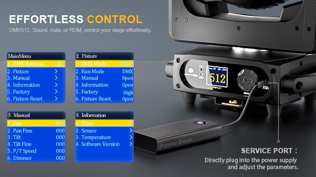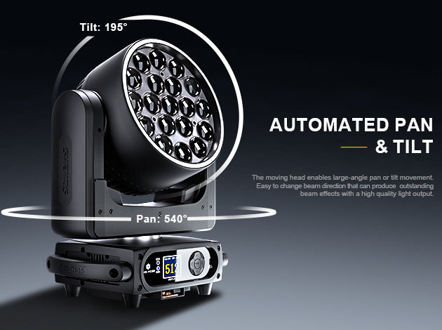 The moving head enables large-angle pan or tilt movement. Easy to change beam direction that can produce outstanding beam effects with a high quality light output.