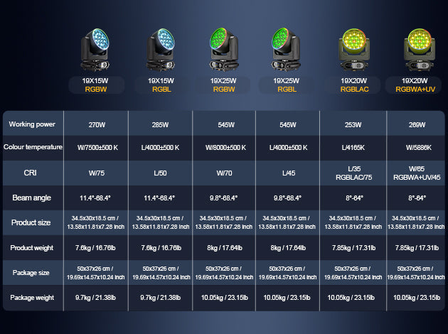19*15W LED RGBL:111600lux @ 1m 21200lux @ 3m 7352 lux @ 5m
