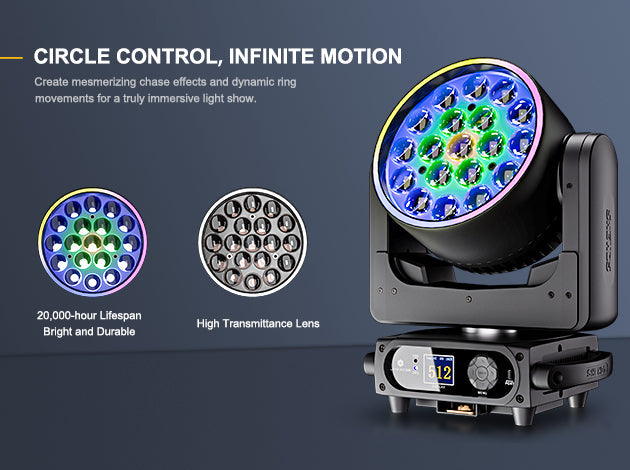 Create mesmerizing chase effects and dynamic ring movements for a truly immersive light show.