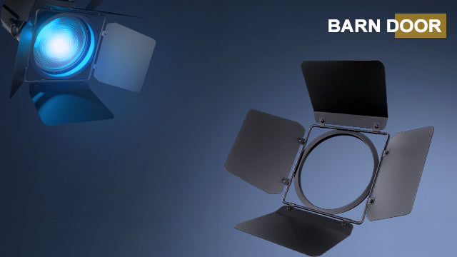 The spotlight comes with an adjustable barndoor that can be mounted in front of its head, allowing precise control over the angle and shape of the beam.