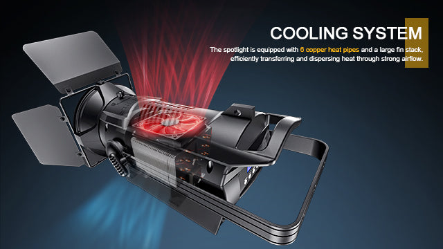 The spotlight is equipped with 6 copper heat pipes and a large fin stack, efficiently transferring and dispersing heat through strong airflow. Its intelligent temperature tracking system continuously monitors internal heat levels and automatically adjusts the fan speed. This ensures stable performance while keeping noise to a minimum during operation.