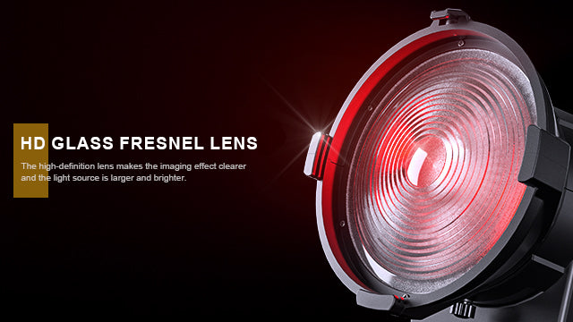 The spotlight is equipped with a large 15 cm high-resolution Fresnel front lens and a secondary dome lens with minimal distortion, ensuring that both the spot and color remain perfectly sharp and accurate across the entire zoom range.