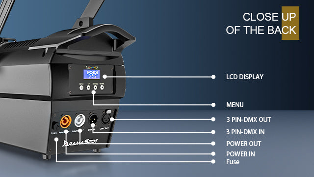 The back of the ellipsoidal features a clear LCD display screen with 4 intuitive touch buttons for easy operation and settings adjustment. It is equipped with power in/out and 3-pin DMX in/out ports, ensuring reliable connections and durability in any environment.