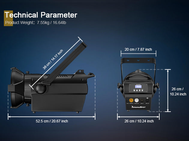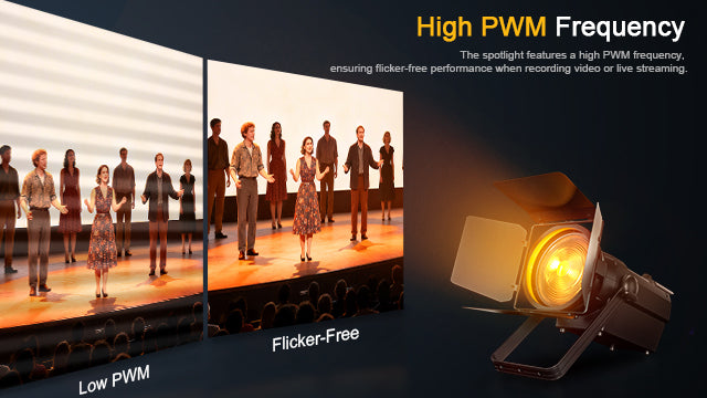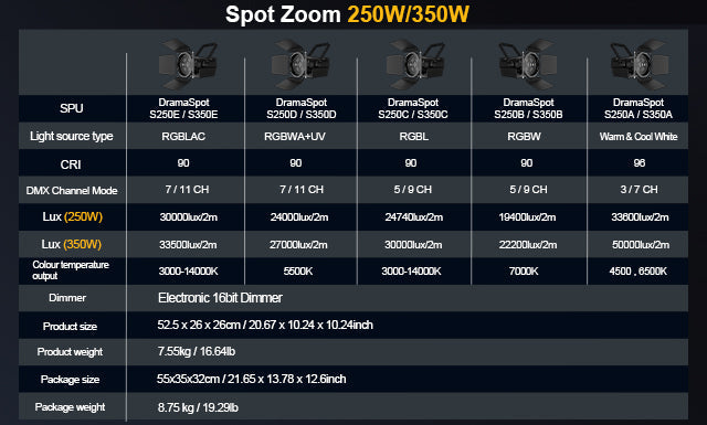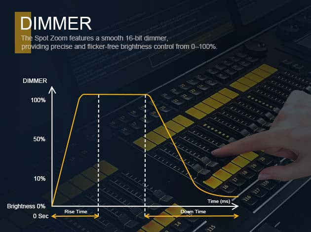 The Spot Zoom250W/350W features a smooth 16-bit dimmer, providing precise and flicker-free brightness control from 0–100%.