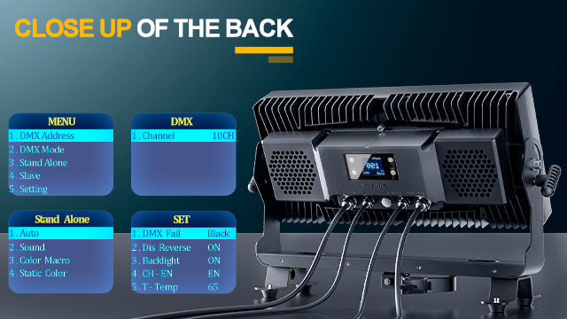 The back of the strobe light features a clear LCD display screen with 4 intuitive touch buttons for easy operation and settings adjustment. It is equipped with IP65-rated power in/out and DMX in/out ports, ensuring reliable connections and durability in any environment.